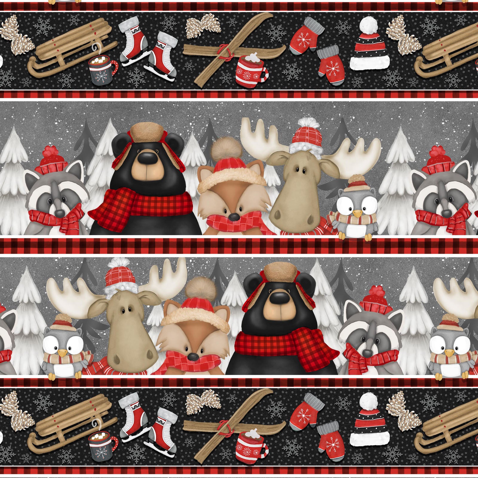 Take a cabin staycation with the Pinecone Ridge Lodge group by Shelly Comiskey for Henry Glass Fabrics. All the woodland creatures are ready for winter activities. Raccoons love to skate, while bears and moose prefer to ski. After a long day in the cold, these critters love to warm up with a cup of cocoa. 100% cotton material, 43/44" wide. Sold in 1-yard increments.